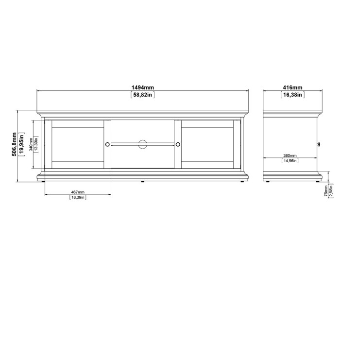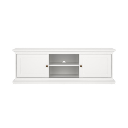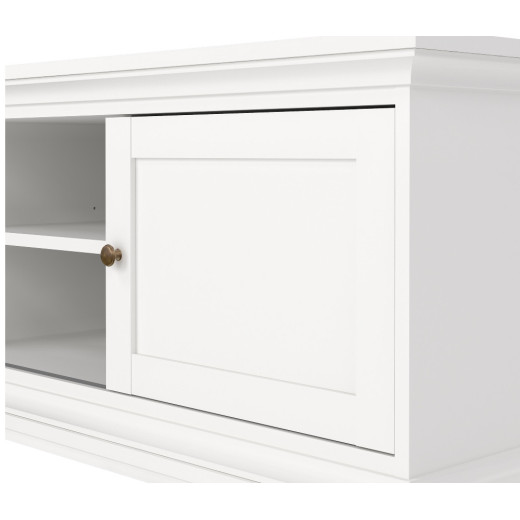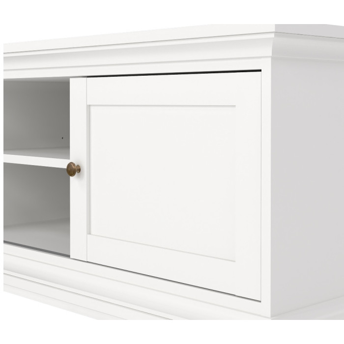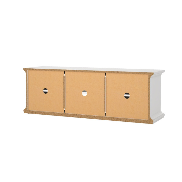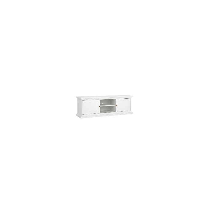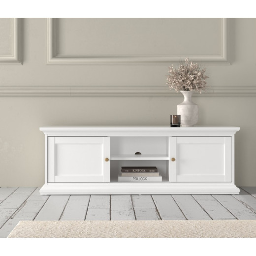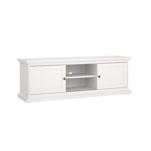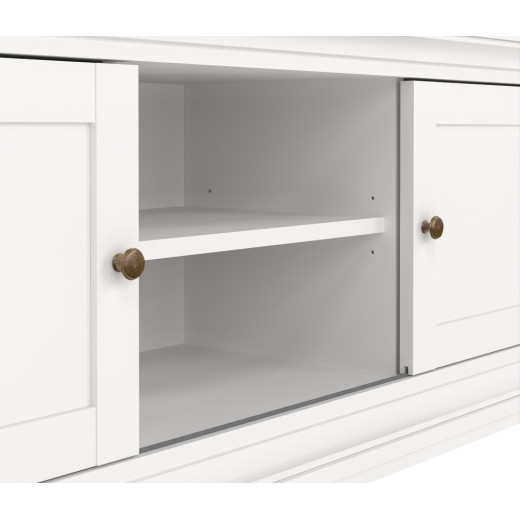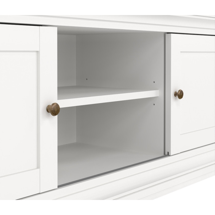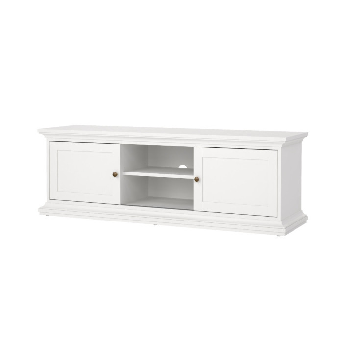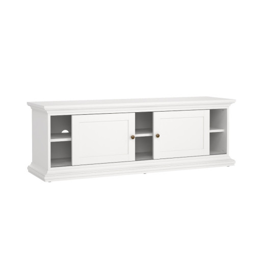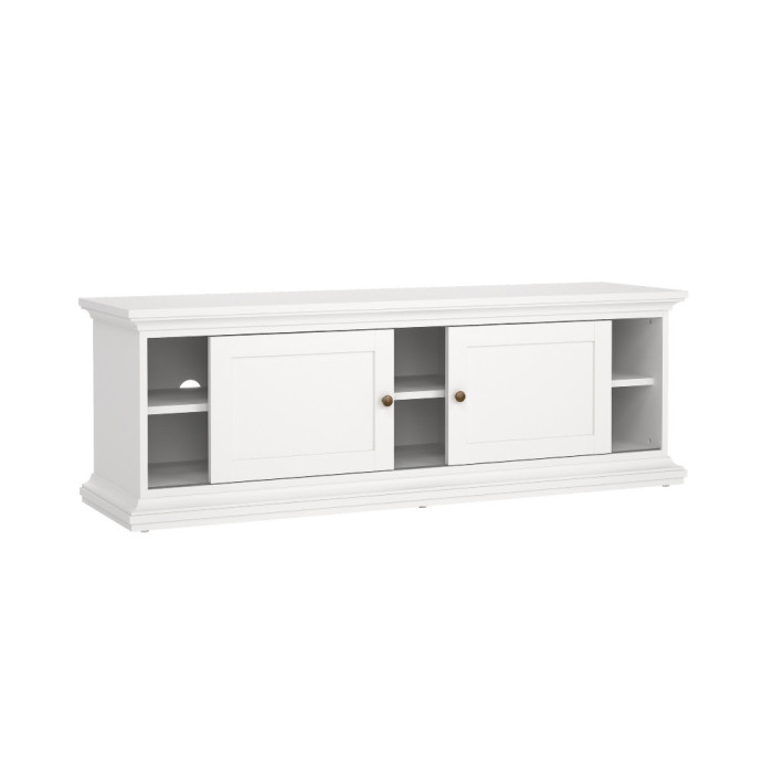 Mesa de TV dos puertas y huecos, acabada en color blanco.