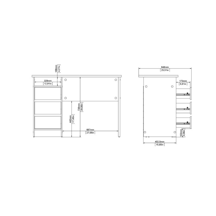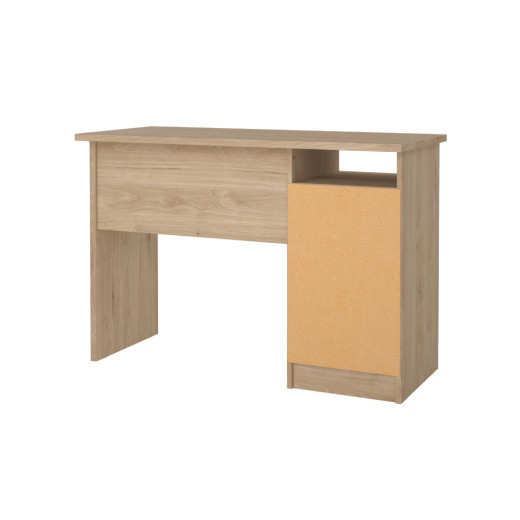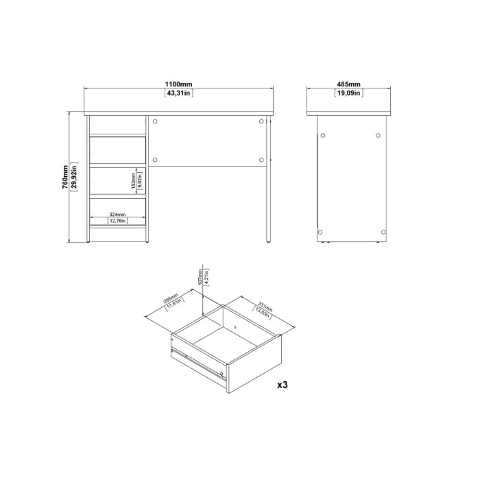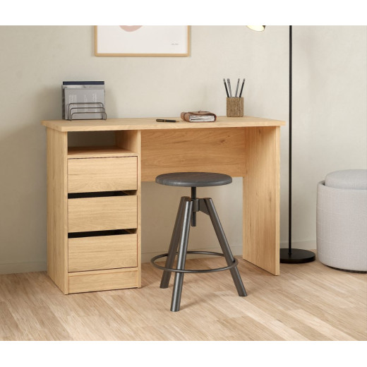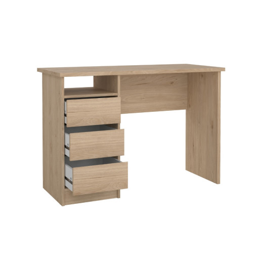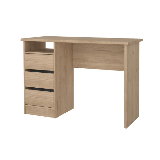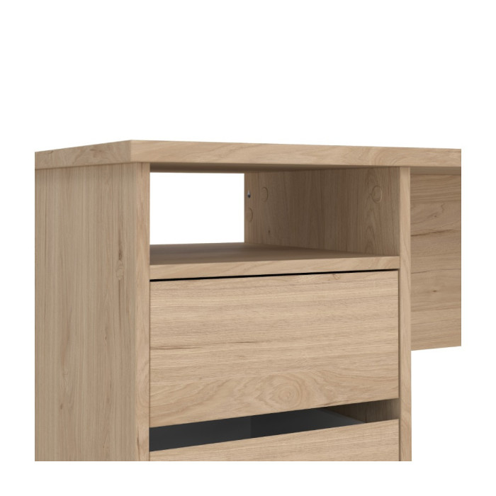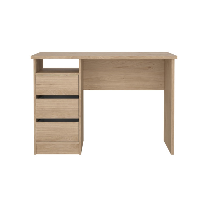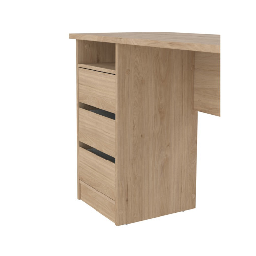Mesa de estudio con tres cajones y hueco, acabado en blanco, roble jackson.