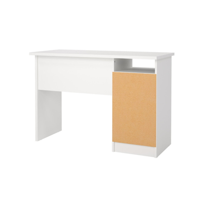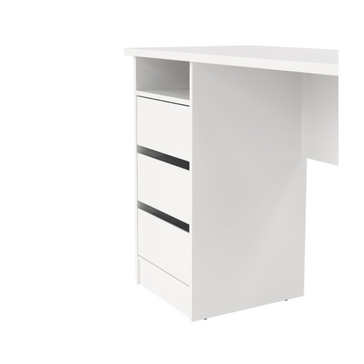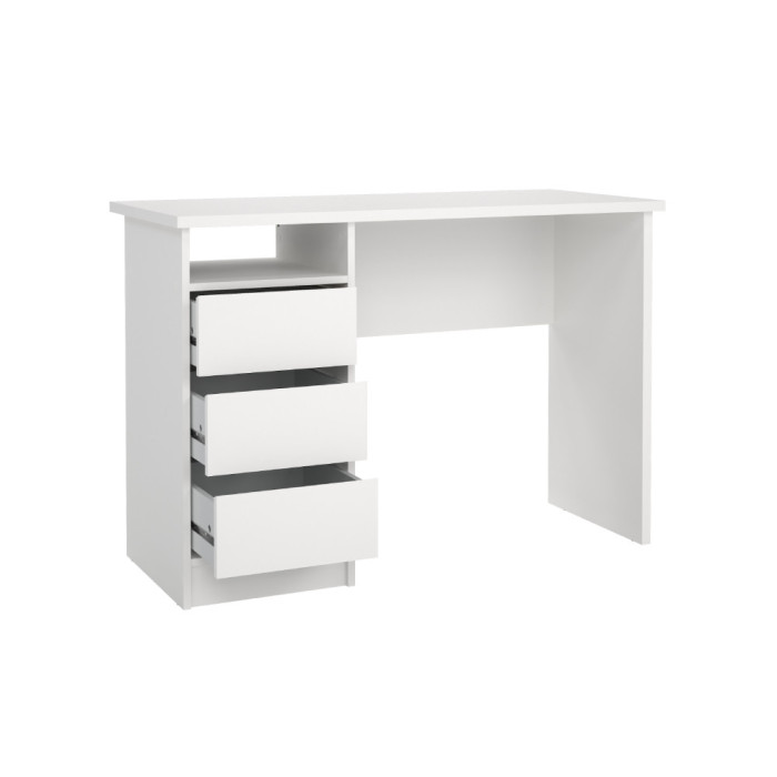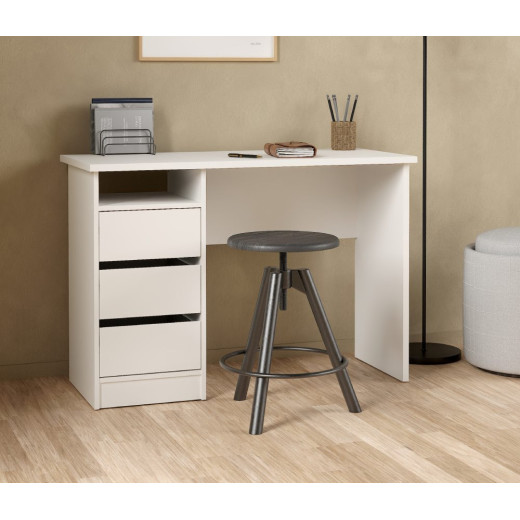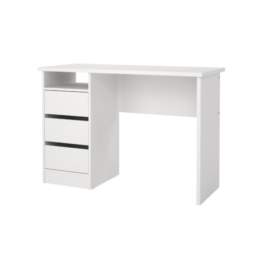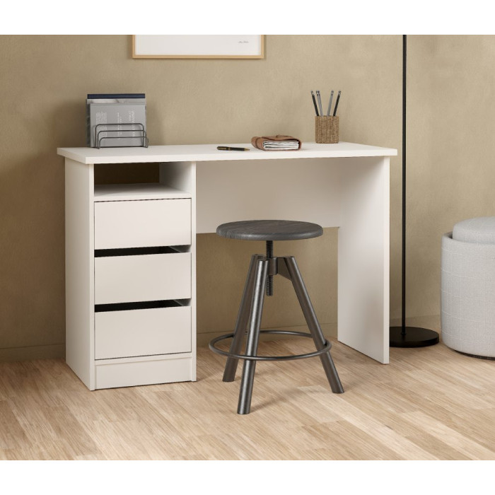Mesa de estudio con tres cajones y hueco, acabado en blanco, roble jackson.