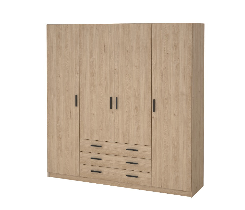 Armario de 4 puertas batientes y 3 cajones acabado en laminado natural en varioos colores a elegir.