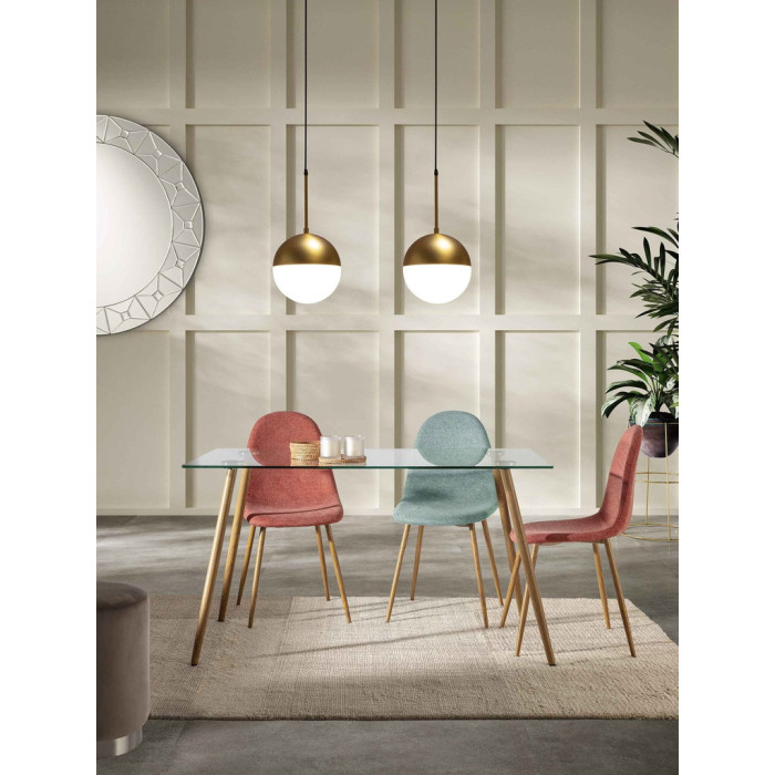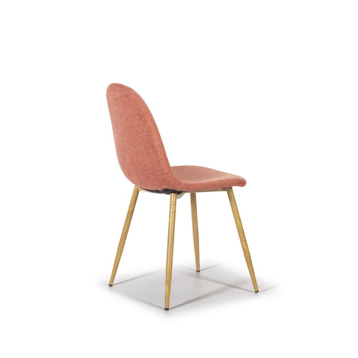 Silla de comedor tapizada en tela con patas metálicas.
