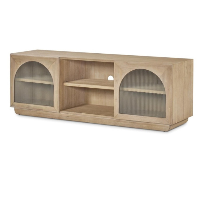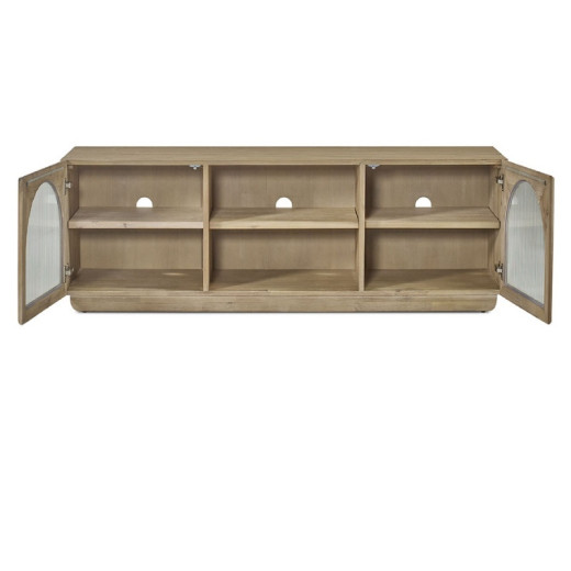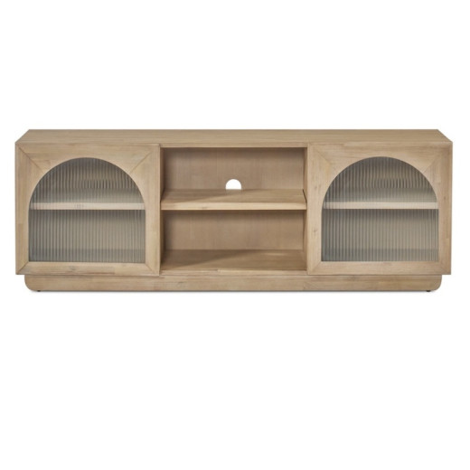 Mueble TV en madera maciza de tres puertas con cristales en forma de arco.