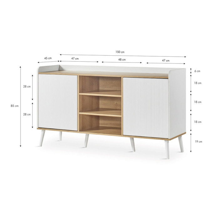 Aparador laminado de 2 puertas y 2 estantes centrales con patas de madera.