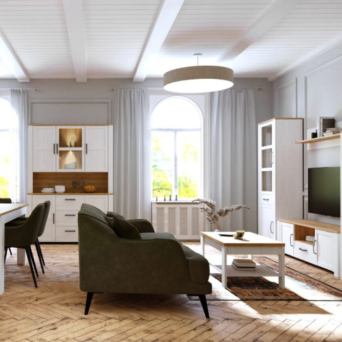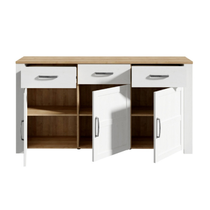 Aparador con 2 puertas y 2 cajones con iluminación led incorporada, acabado en color Blanco Sand combinado con Roble Mauvella.