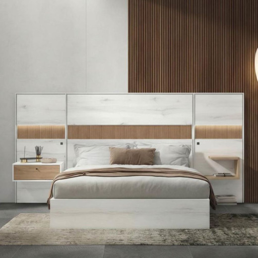 Dormitorio compuesto por un cabecero sin leds, con 2 alas con o sin leds y 2 mesillas a juego para camas desde 135 hasta 180 cm.