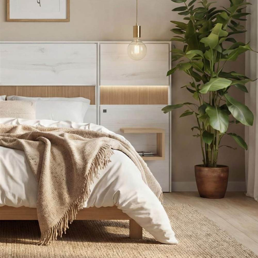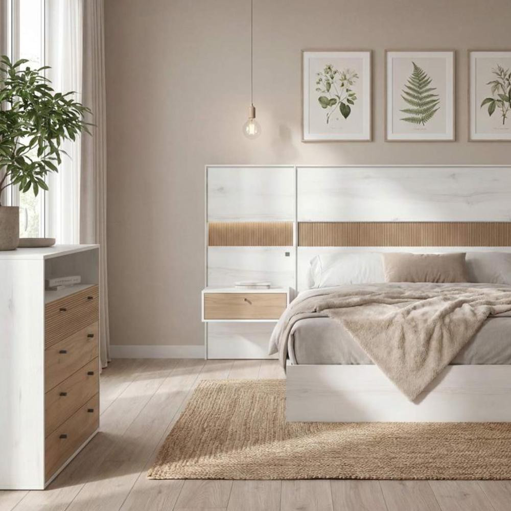 Si te gusta el diseño que se ve “limpio”, pero se siente especial, este conjunto es para ti. Su estética nórdica-cálida, con aire hotel boutique, proporciona equilibrio y una presencia que eleva el dormitorio sin esfuerzo.
