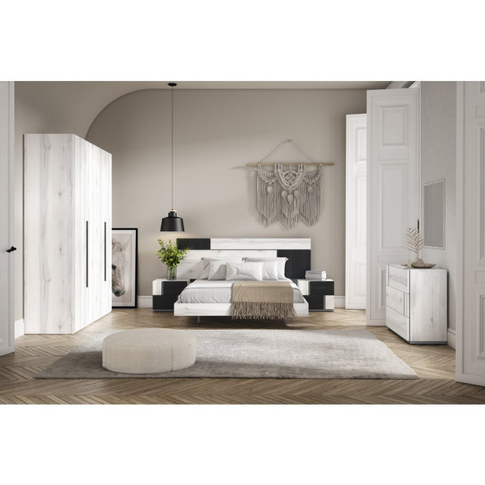 Dormitorio compuesto por un cabecero sin leds, con 2 alas con o sin leds y 2 mesillas a juego para camas desde 135 hasta 180 en color Albo combinado con Iris y vaiven.