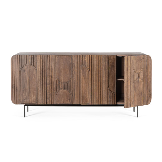 Este aparador ANTICO no es solo un mueble, sino una declaración de estilo, un refugio de armonía en cualquier espacio, que capta la atención sin necesidad de alardes. La estructura se eleva con discretas patas metálicas que añaden ligereza al conjunto, creando un contraste delicado entre la riqueza orgánica de la madera y la modernidad del metal. Perfecto para un salón de líneas limpias o un comedor de estética moderna, es una pieza que trasciende tendencias, llevando consigo una elegancia atemporal.