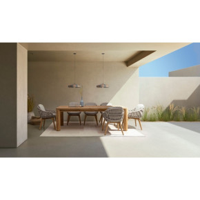 Tanto la tapa como las patas están fabricadas en madera maciza de teca reciclada, proveniente de bosques gestionados de manera responsable. El acabado natural cepillado potencia la textura orgánica de la madera, mientras que la tornillería en acero inoxidable garantiza durabilidad incluso en exteriores.