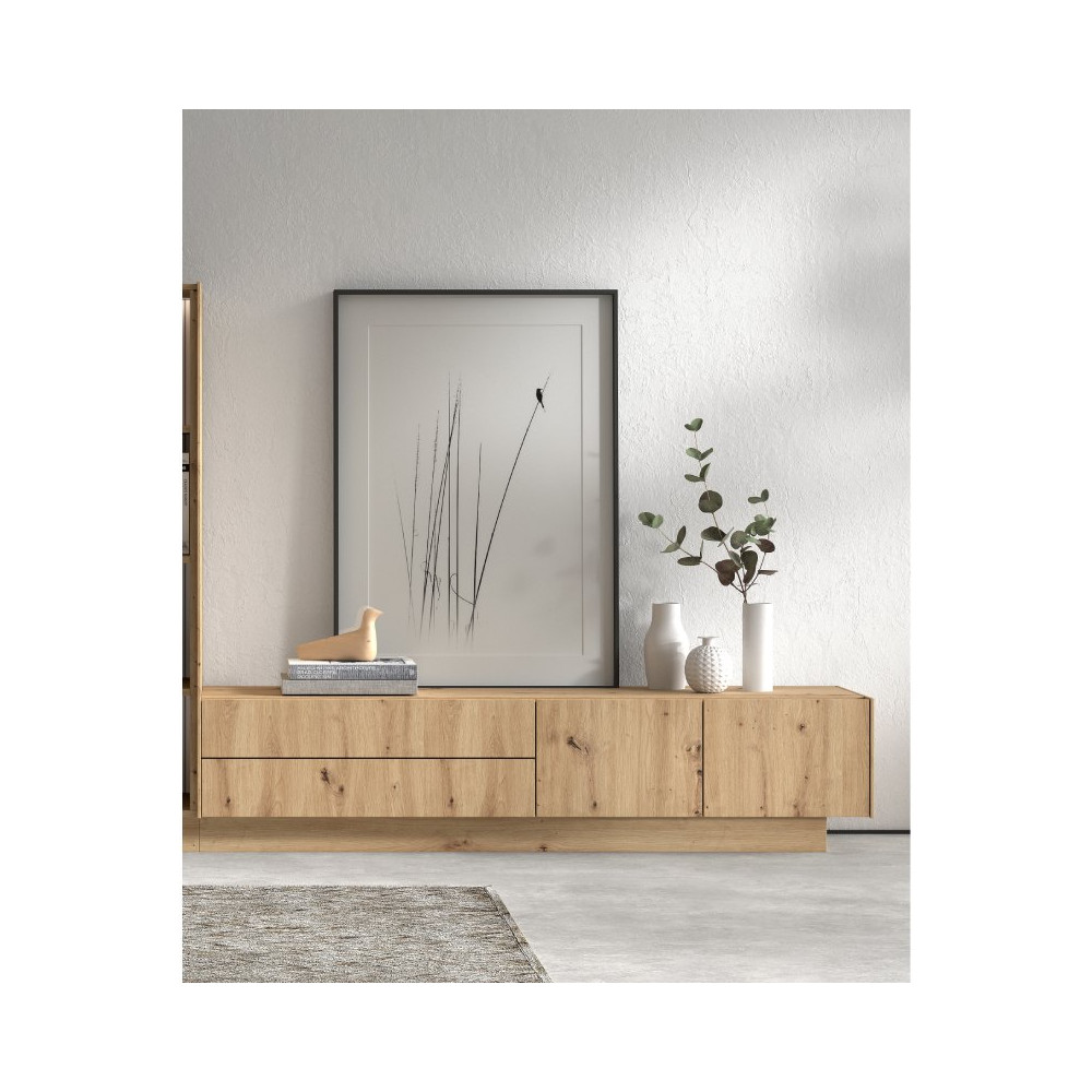 Aparador bajo de 180x42x45,2 cm en tablero laminado natural de roble artesano. Con herrajes premium, cajones con freno y tiradores de madera. En mueblesrey.com.