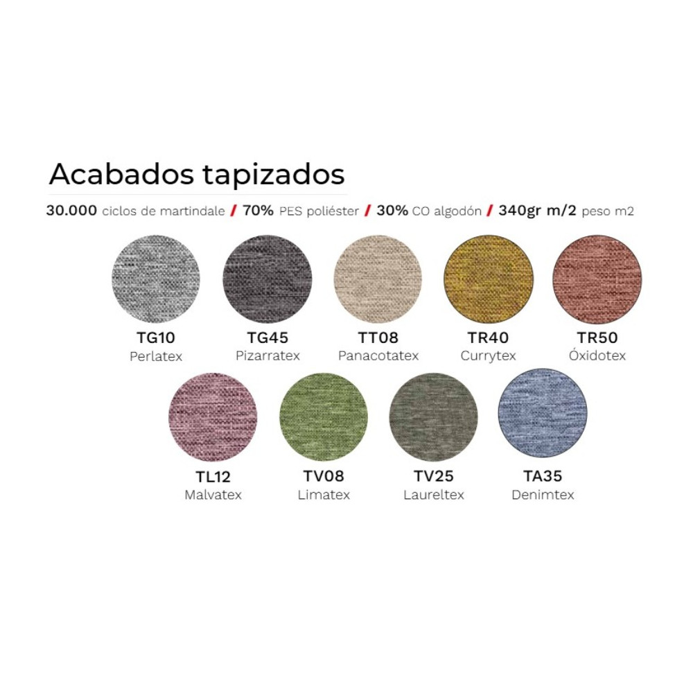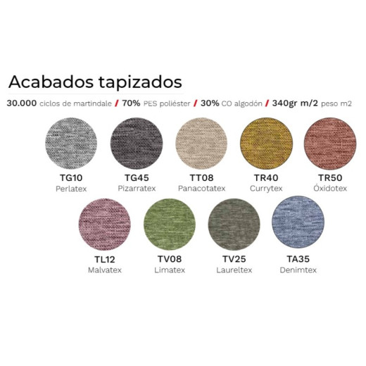 Tapizado: 70% PES poliéster y 30% CO algodón.