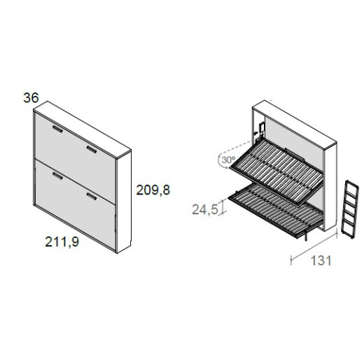 Incluye sólo la litera de dos camas abatible horizontal y la escalera (tal y como muestra el esquema). No incluye el altillo, estantes ni complementos decorativos. La imagen es una sugerencia de ambientación. Si quieres más complementos, no dudes en contactarnos para personalizarte este dormitorio.