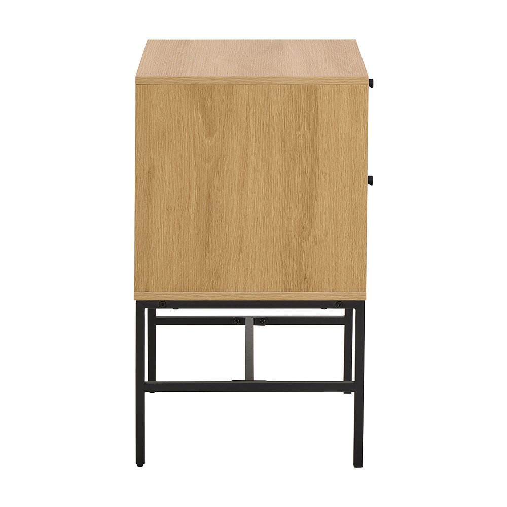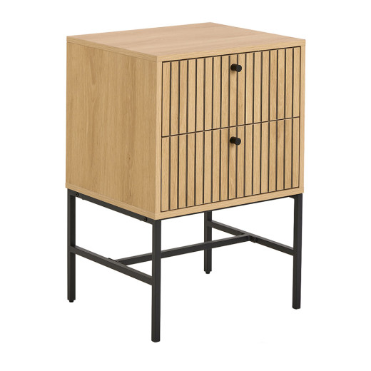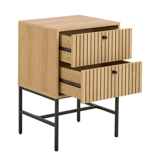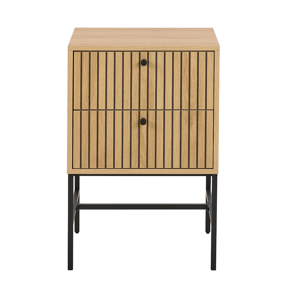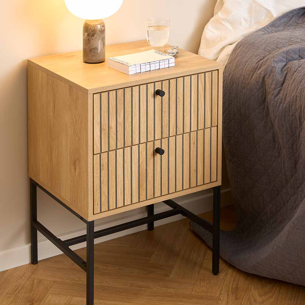 La mesa de noche ALBERT es el equilibrio perfecto entre lo funcional y lo estético. Su diseño vertical, con líneas limpias y depuradas, destaca por su estructura en madera natural con efecto roble y una base metálica en negro mate que aporta robustez y un aire industrial muy sofisticado.