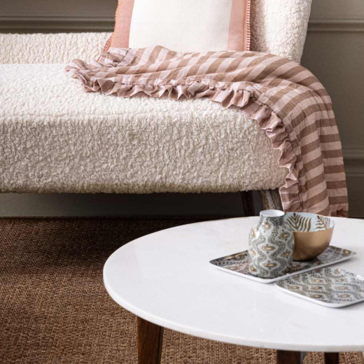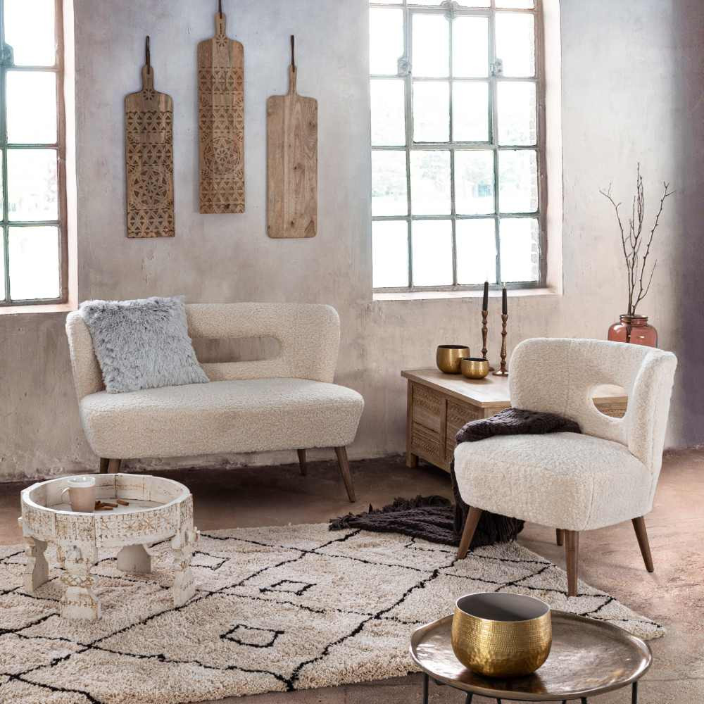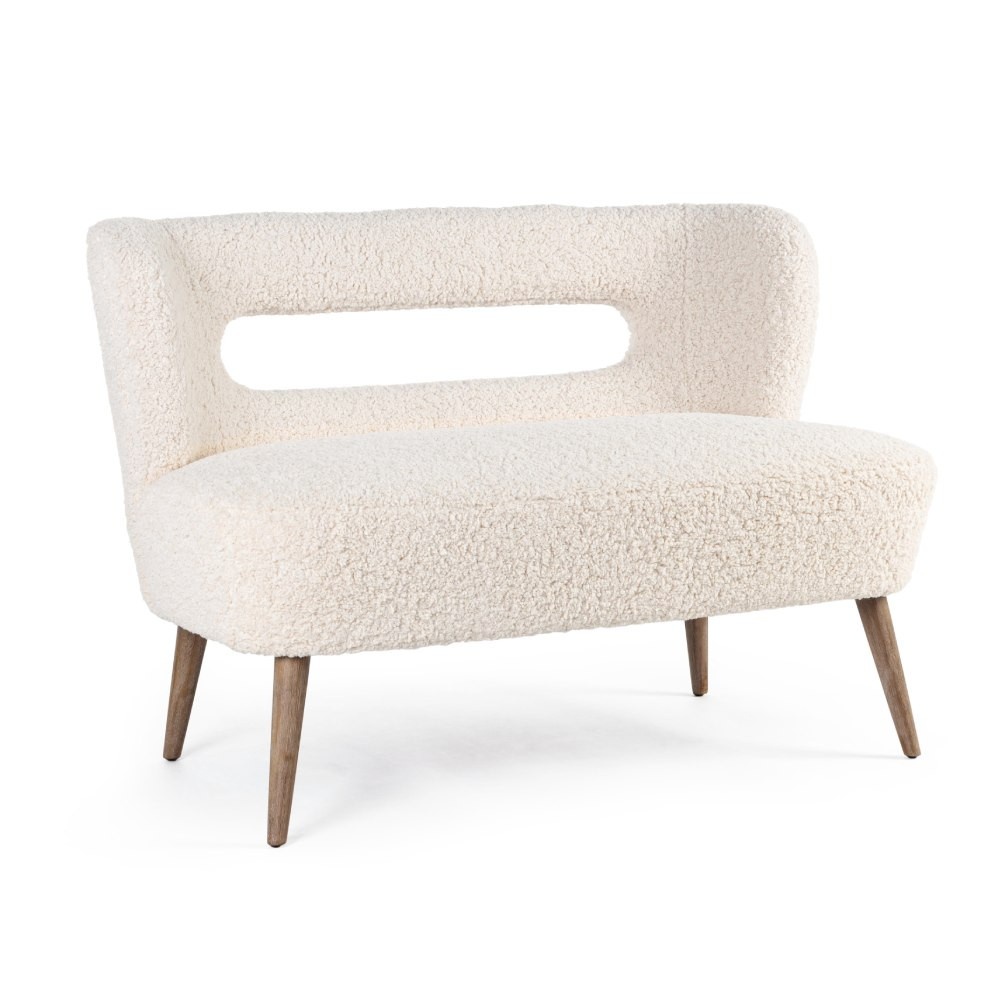 Las líneas del sofá TENDA tapizado en tejido bouclé blanco es una declaración de sofisticación. Su respaldo curvado con apertura central aporta un aire escultórico y moderno, convirtiéndolo en una pieza que no solo ofrece confort, sino también un toque de diseño de vanguardia para cualquier ambiente..