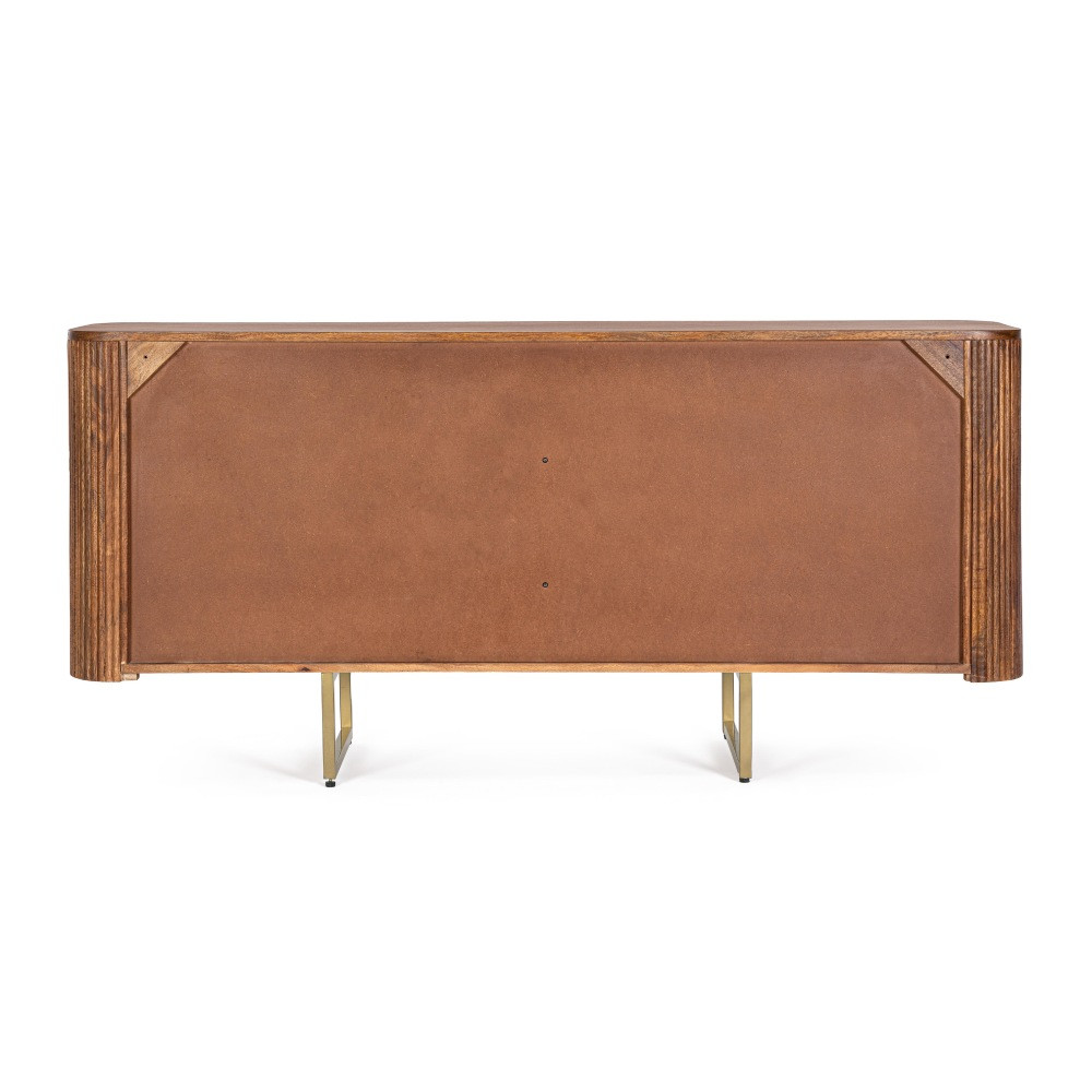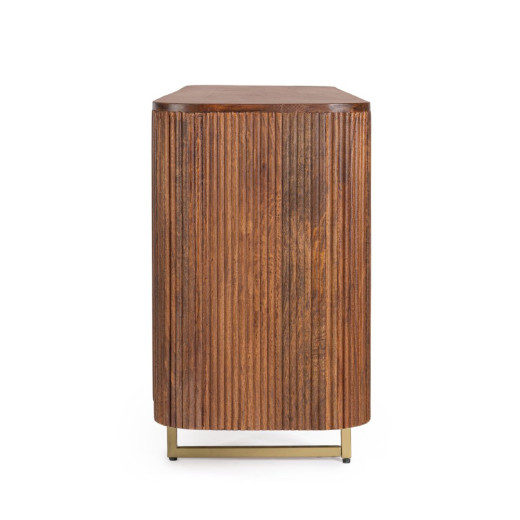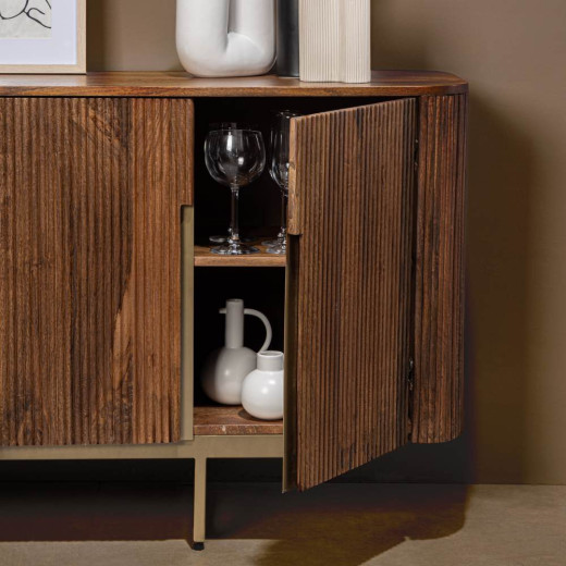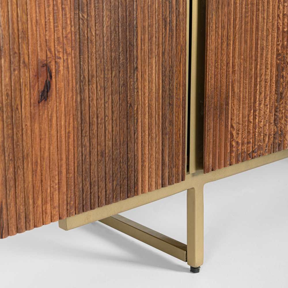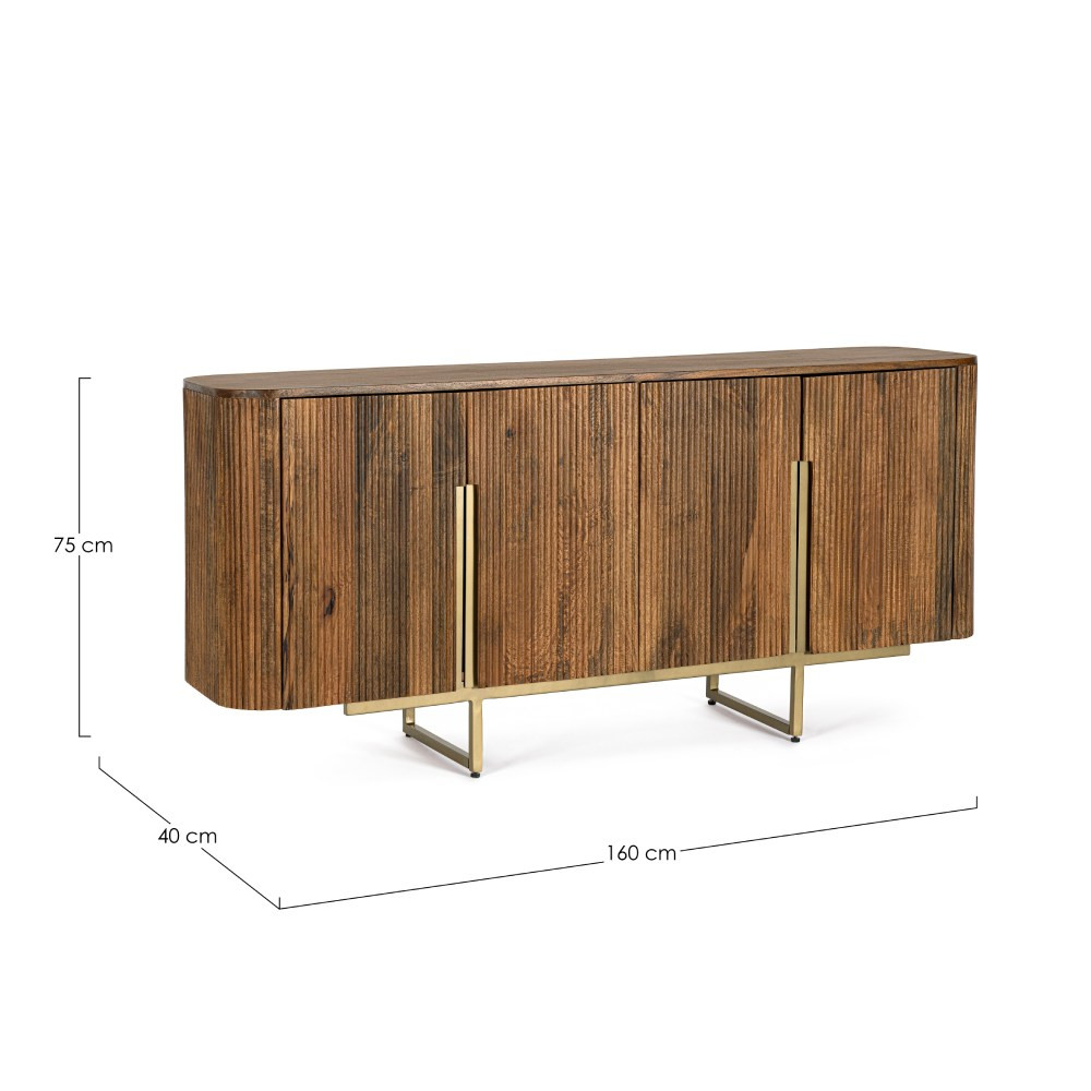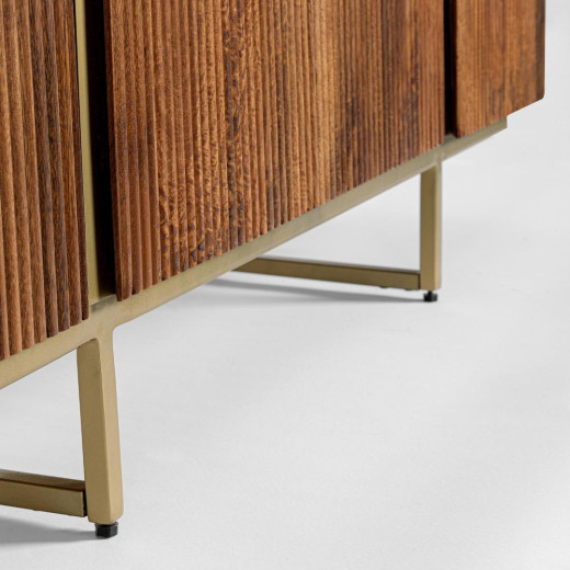 Este aparador de líneas limpias y elegantes combina la calidez de la madera con la modernidad de sus patas metálicas en acabado dorado. El diseño frontal con lamas verticales aporta textura y movimiento, convirtiéndolo en un mueble con carácter que se adapta a diferentes estilos decorativos.