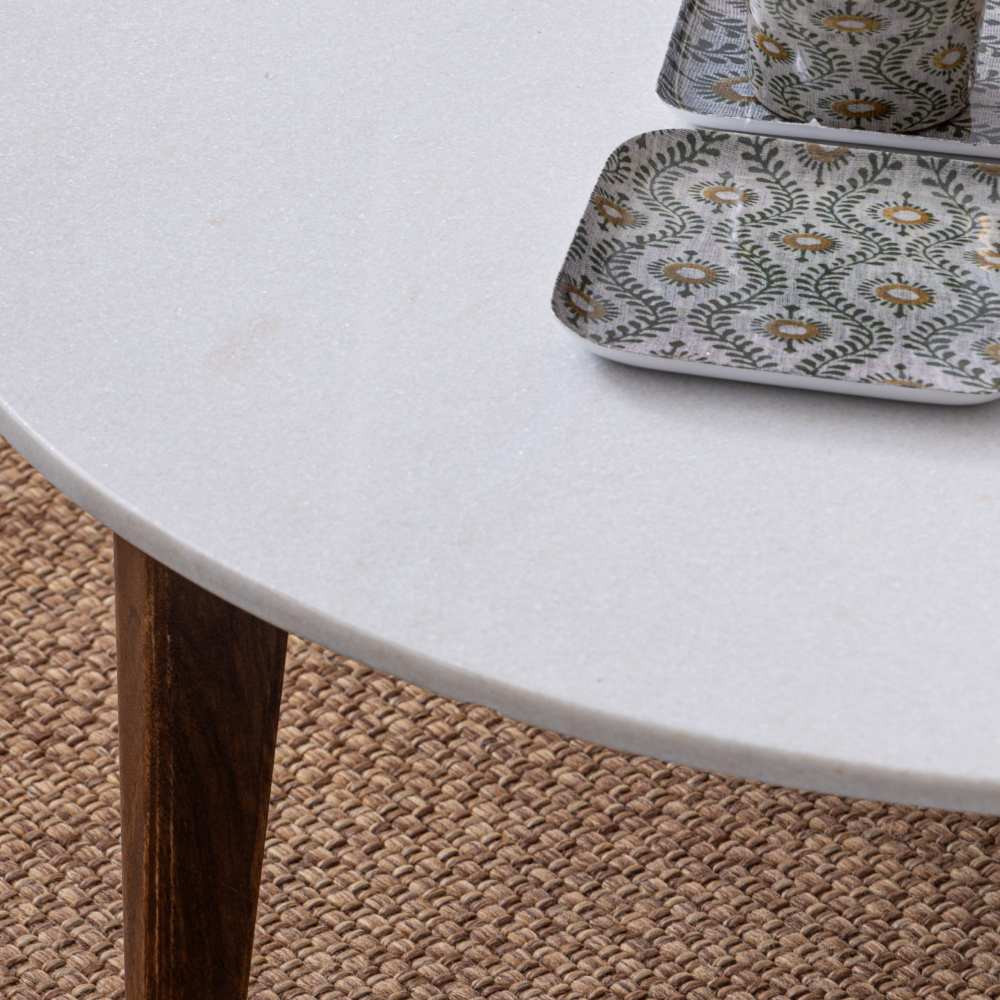 Mesa auxiliar ovalada ó redonda con tablero de mármol y patas de madera de mango. Varias medidas a elegir.