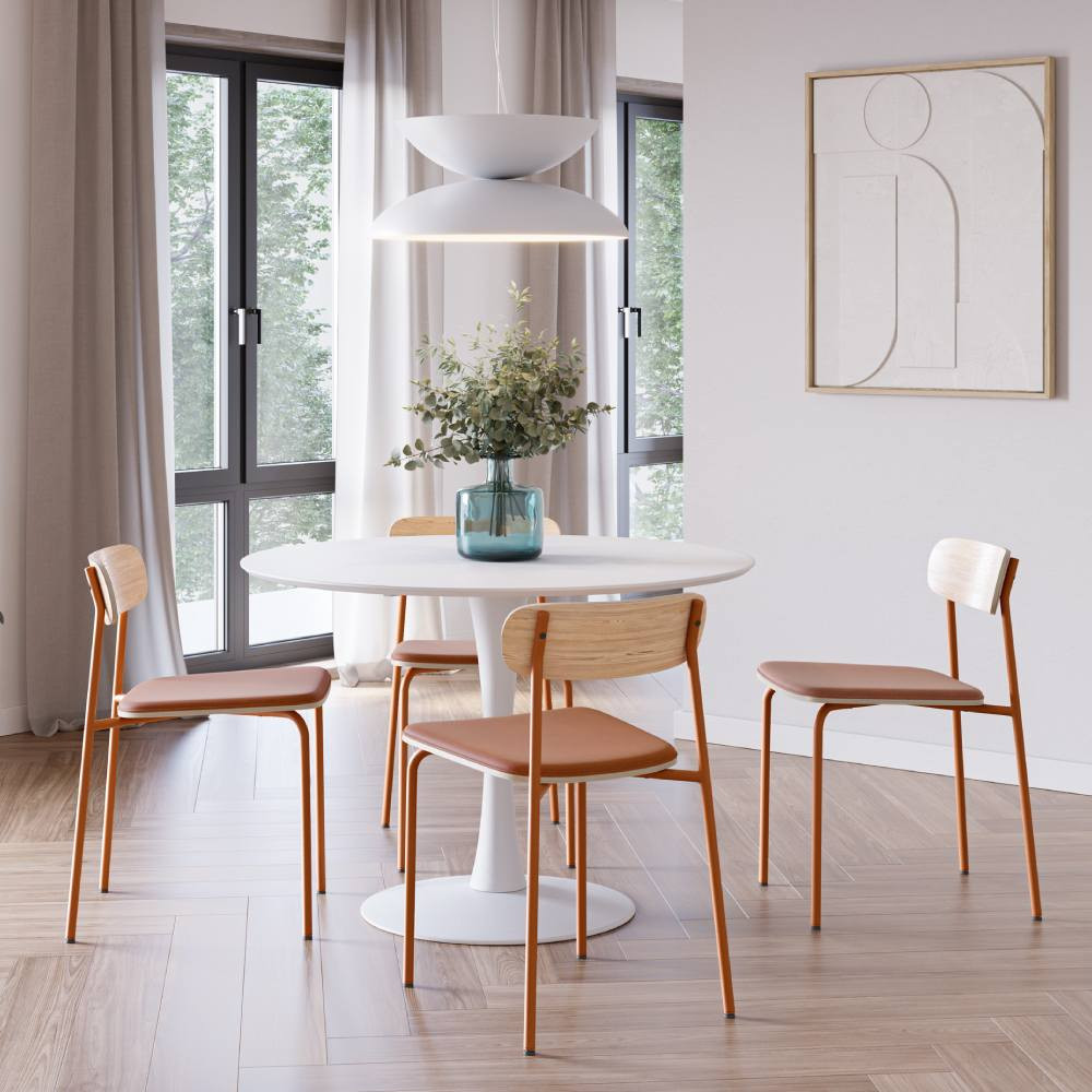 La Silla OLEN refleja la esencia del diseño escandinavo: sencillez, luminosidad y equilibrio. Su respaldo en madera natural aporta calidez y textura, mientras que la estructura metálica en tono claro añade ligereza visual y un aire contemporáneo. Es una pieza que combina la belleza de lo natural con la precisión del diseño moderno.