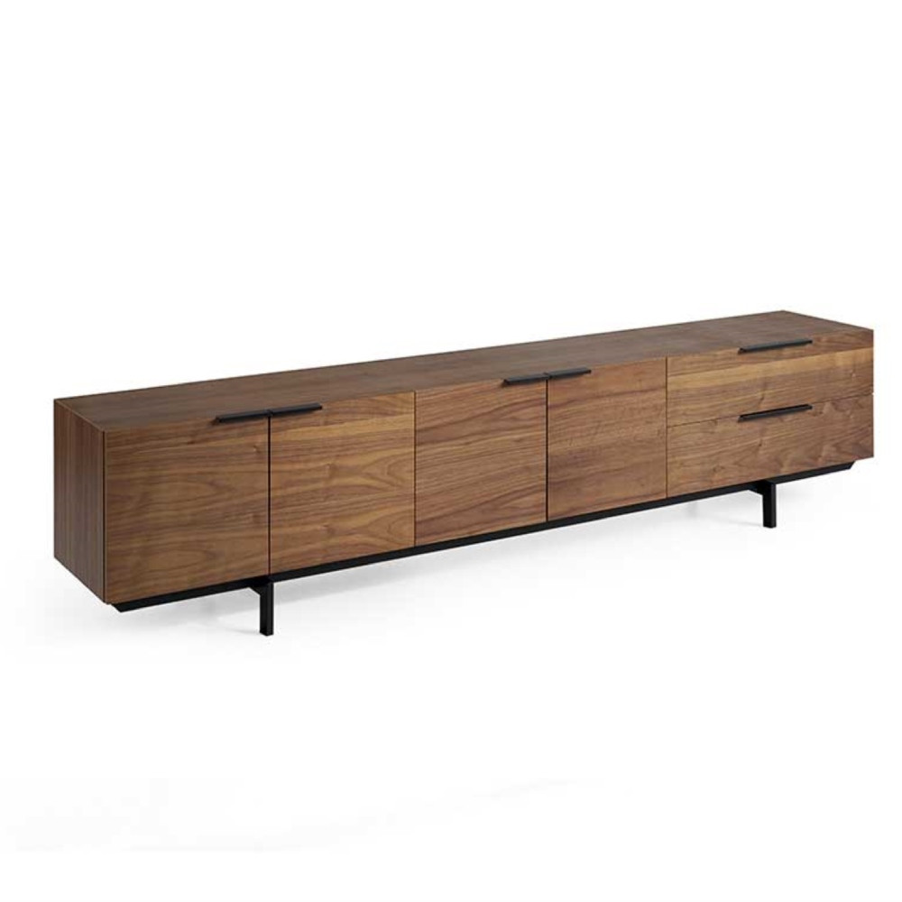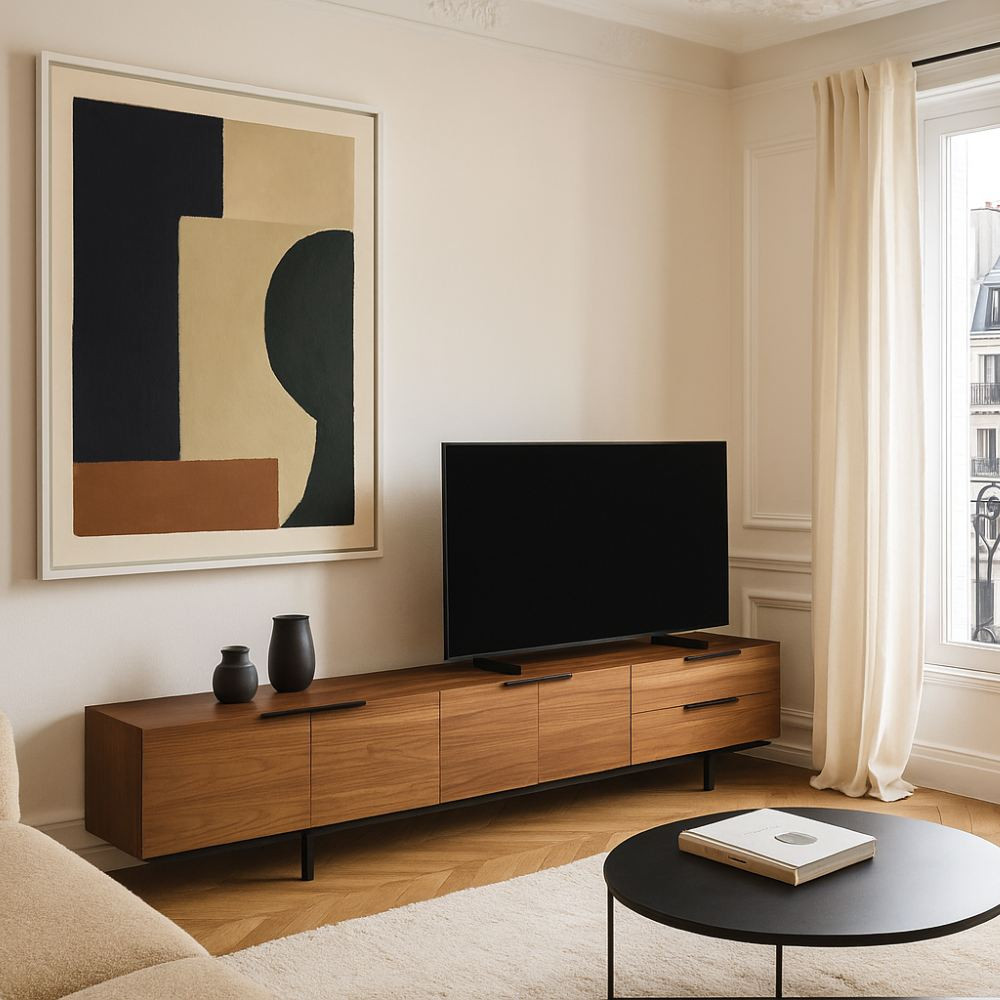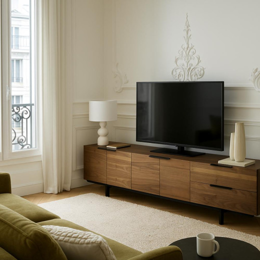 Con líneas puras y una presencia serena, esta mesa TV se convierte en el eje estético del salón. El frente en madera de nogal realza las vetas naturales, mientras la base y los tiradores en metal negro estilizan la silueta y le aportan un aire contemporáneo. Su perfil bajo equilibra proporciones y crea una atmósfera relajada, perfecta para interiores con carácter.