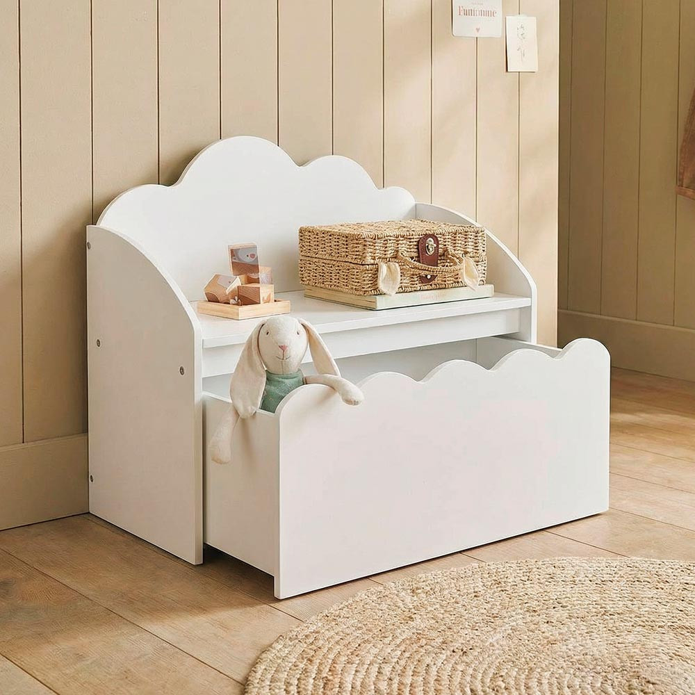 Banco baúl detalle trasera nube, color blanco.