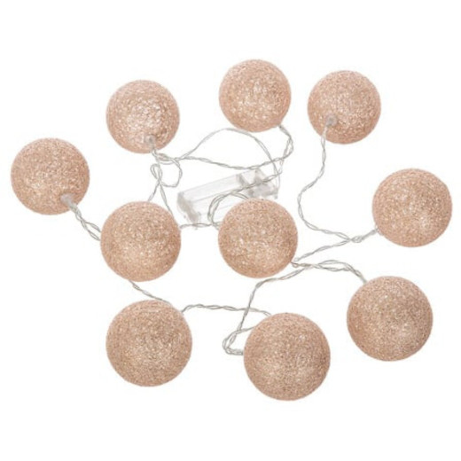 Eleva la atmósfera de cualquier estancia con esta guirnalda de bolas en un delicado tono. Su luz cálida y homogénea crea un efecto envolvente que invita al relax y aporta un encanto natural a dormitorios, salones o rincones de lectura.