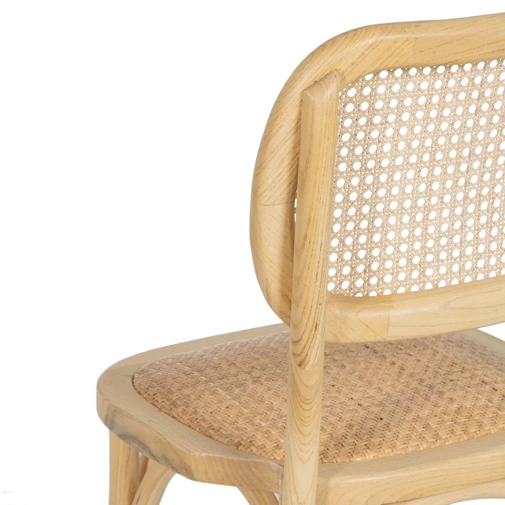 La madera maciza garantiza resistencia y estabilidad, y el ratán natural ofrece una sentada cómoda y transpirable.