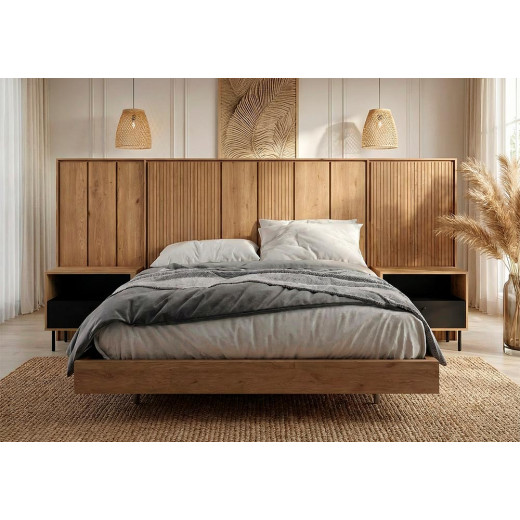 Dormitorio compuesto por un cabecero con 2 alas laterales y 2 mesillas a juego para camas desde 135 hasta 180 en color Naturale-Rayado-Bocamina.