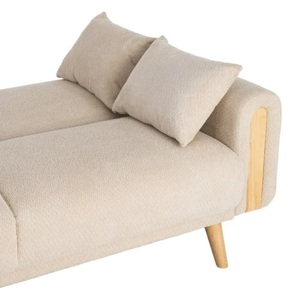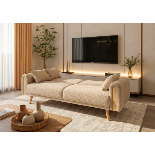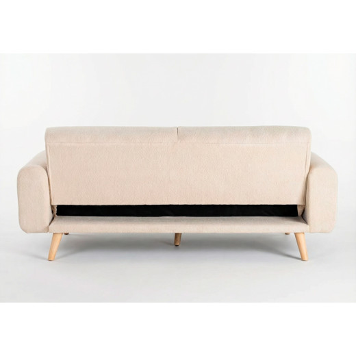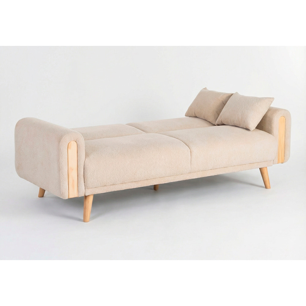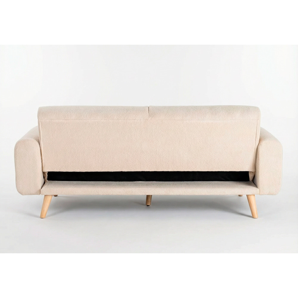 Sofá cama apertura click-clack, tapizado beige y con patas de madera.