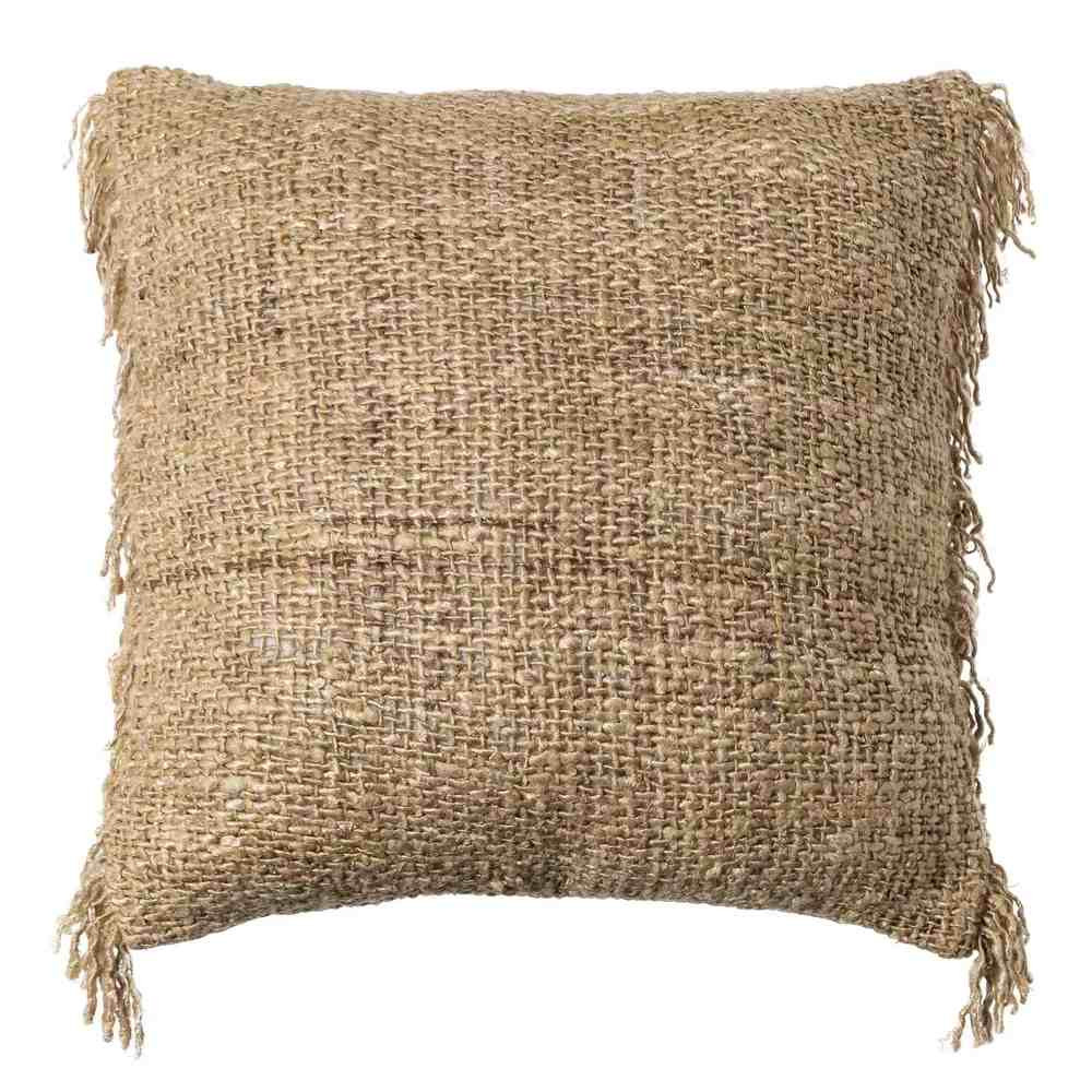 Un toque natural, sobrio y con mucha presencia. Este cojín de estética artesanal destaca por su trama marcada tipo yute/arpillera en tono arena y por sus flecos en las esquinas, un detalle sutil que aporta carácter sin recargar. Ideal para hogares que cuidan el diseño, las tendencias y la calidez de los materiales honestos.
