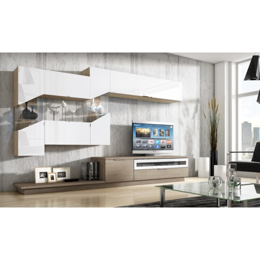 Conjunto de muebles de salón moderno compuesto por mueble para TV, vitrinas de cristal transparente y módulo alto de puerta abatible. Fabricado en laminado natural y acabado en roble seda y lacado blanco. Medidas: 297,5 x 50/35 cm (despiece abajo)