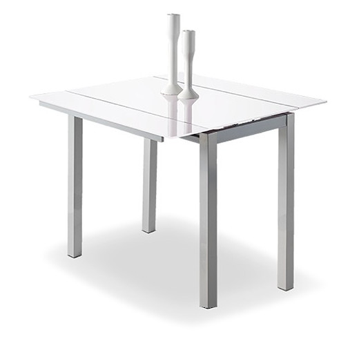 Mesa de cocina extensible con estructura metálica con acabado níquel mate y encimera y alas en cristal templado. Medidas: 95 x 55 / 95 x 76 cm.