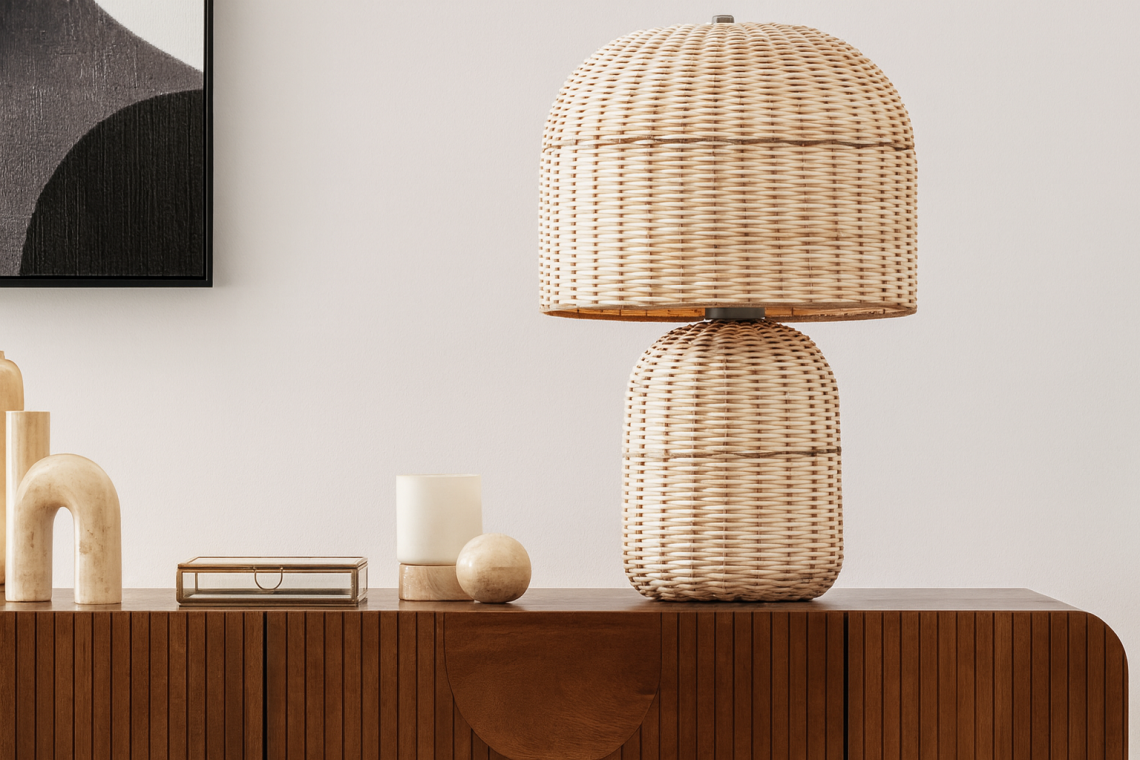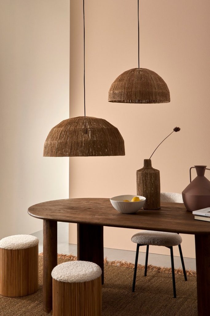 Madera, lino, fibras trenzadas o cerámica aportan calidez y autenticidad.