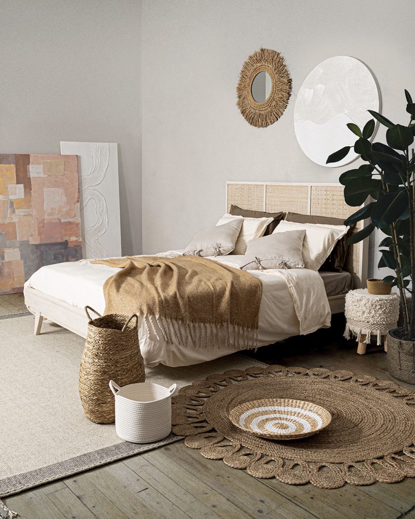 - Accesorios naturales: cestas de mimbre, bandejas de madera y jarrones de barro.
